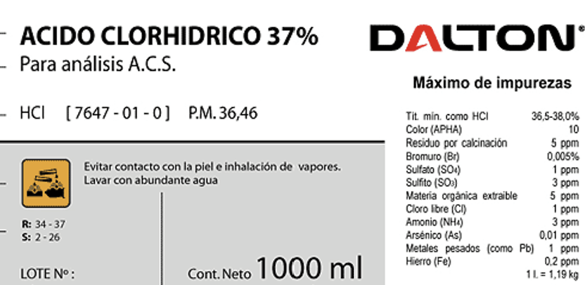 La etiqueta de un reactivo nos da información valiosa para poder comenzar de manera correcta una preparación, recuerda que si aquí comenzamos mal, todo estará mal. Regresando a la etiqueta… no es lo mismo un reactivo que dice «37%» que uno que indica su pureza o grado (reactivo, trace, suprapur, etc.). El 37% nos dice que hay 37 gramos de HCl puro por cada 100 gramos de solución, es decir nos habla de cuánto ácido o reactivo en cuestión hay disuelto.